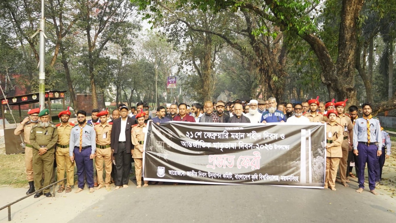 যথাযথ মর্যাদা ও ভাবগাম্ভীর্যের সাথে বাংলাদেশ কৃষি বিশ্ববিদ্যালয়ে পালিত হয়েছে মহান শহীদ দিবস ও আন্তর্জাতিক মাতৃভাষা দিবস। দিবসটি উপলক্ষে শনিবার (২১ ফেব্রুয়ারি) সকাল সাড়ে ৮ টায় জাতীয় দিবস উদযাপন কমিটির ব্যবস্থাপনায় প্রভাত ফেরি বিশ্ববিদ্যালয়ের বৈশাখী চত্বর হতে শুরু হয়।এতে জাতীয় দিবস উদযাপন কমিটির সভাপতি ও ছাত্র বিষয়ক উপদেষ্টা অধ্যাপক মো. শহীদুল হক, প্রক্টর অধ্যাপক মো. আবদুল আলীম, রেজিস্ট্রার মো. হেলাল উদ্দীন, কোষাধ্যক্ষ অধ্যাপক মো. হুমায়ূন কবিরসহ বিভিন্ন বিভাগের শিক্ষক, শিক্ষার্থী ও কর্মকর্তারা বিশ্ববিদ্যালয় অনুমোদিত সকল শিক্ষা প্রতিষ্ঠান ও সংগঠনগুলো অংশ নেন। কেন্দ্রীয় শহিদ মিনারে গিয়ে প্রভাতফেরি শেষ হয়।