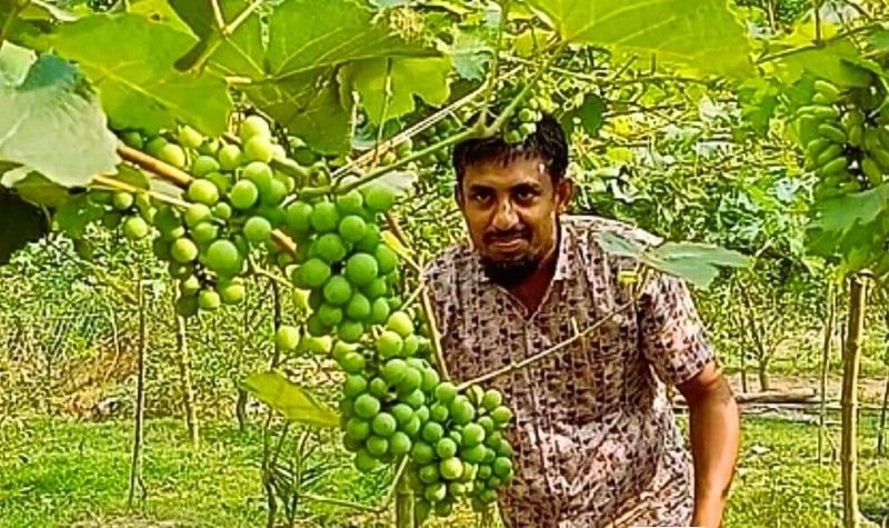 বাঁশ ও সুতায় বানানো মাচায় ঝুলছে থোকা থোকা আঙুর—কোনোটির রঙ হালকা সবুজ, কোনোটির রক্তিম, আবার কোনোটির লম্বাটে আকার। রাশিয়া, ইতালি ও ভারতসহ বিভিন্ন দেশ থেকে সংগ্রহ করা এসব চারাগাছের প্রায় ৫০টি গাছে এ বছর ফল এসেছে। ইতিমধ্যে তিন মণ আঙুর ৫০০ টাকা কেজি দরে বিক্রি করে তিনি পেয়েছেন ৬০ হাজার টাকা। মাচা তৈরি থেকে চারা কেনা—সব খরচ মিলিয়ে ব্যয় হয়েছিল প্রায় ৩৫ হাজার টাকা। আরও তিন মণ আঙুর গাছে ঝুলছে, দর্শনার্থীদের মধ্যে তিনি দুই মণ বিতরণও করেছেন।